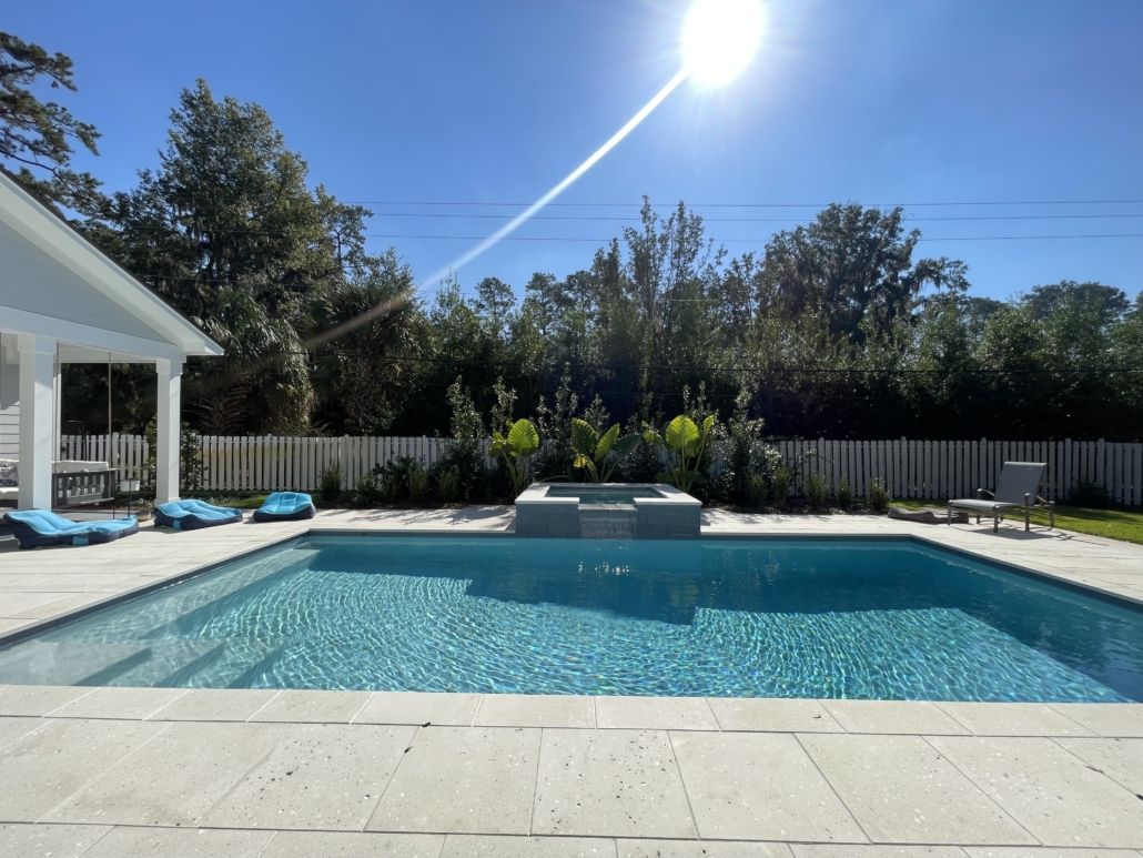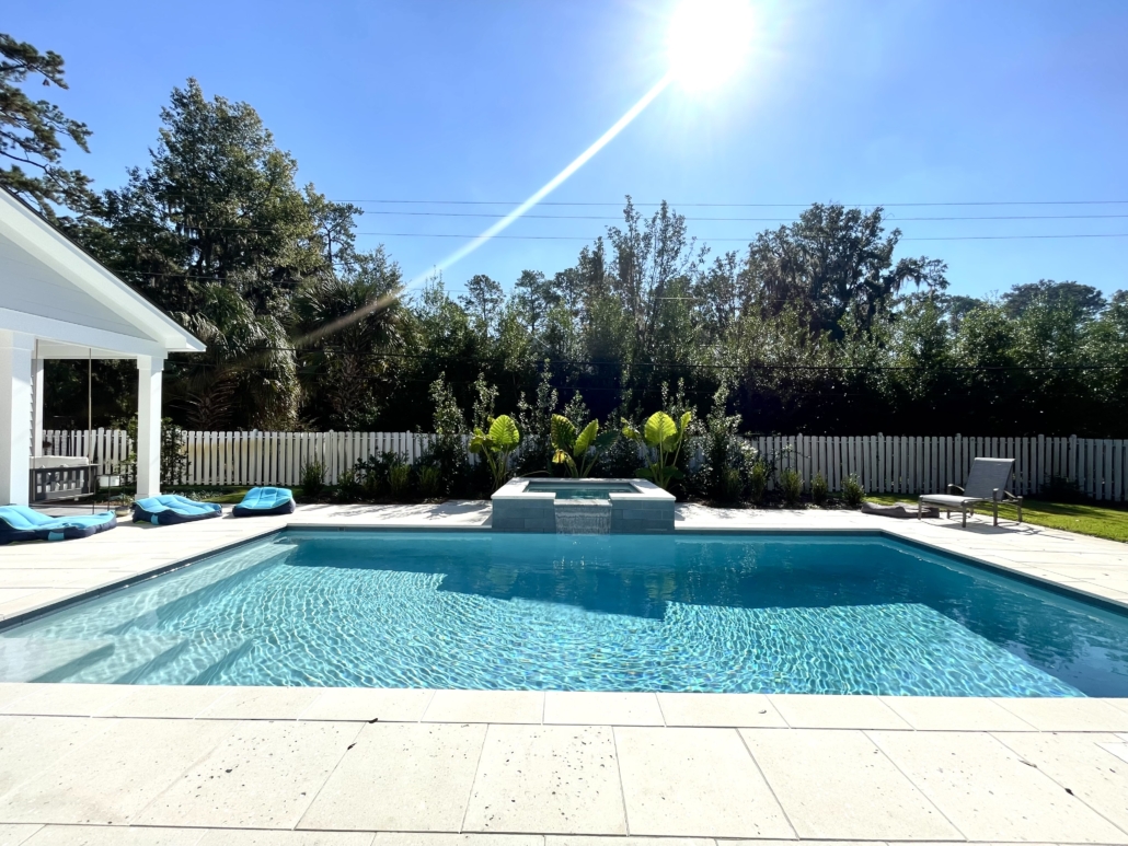 Savannah, GA – This Bradley Point residence balances modern comfort with timeless style. The outdoor living space is defined by a clean-lined pool surround, finished with natural stone that highlights the crisp blue water. Thoughtful landscaping softens the edges, while a raised spa adds both visual interest and functionality. The result is a private retreat that feels equally suited for entertaining or quiet relaxation.